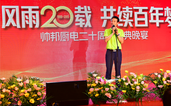 晚会现场帅邦厨卫电器董事长冯兆初先生为公司成立20周年,发表了热情洋溢的致辞,首先回顾帅邦20年发展历程,20年,帅邦从一个仅有几名员工的作坊式小工厂,发展到研、产、销一条龙的国家高新技术企业。20年来,在所有帅邦人以及合作伙伴的支持与鼓励下,帅邦厨卫电器走出了一条勇于突破的创新之路:一条精益求精的匠心之路;一条合作共赢的成长之路。面对未来,帅邦人要把握机遇,风雨同舟,共同为实现百年帅邦努力奋斗。
