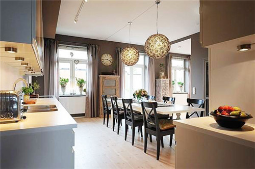 开放性厨房就餐时上菜快速简便,能充分利用空间。只是需要注意控制厨房油烟问题,也不能破坏进餐的气氛。有自然的隔断,餐桌上最好有照明灯具。