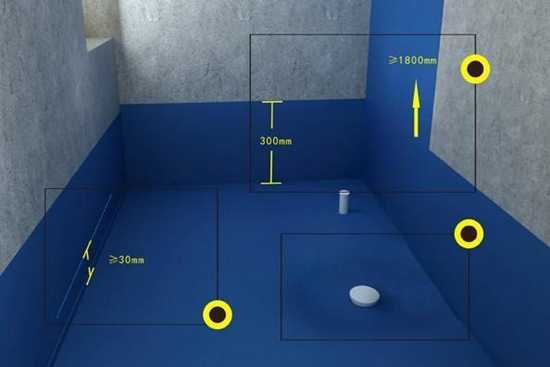 3、基层表面应平整,不得有空鼓、起砂、开裂等缺陷。基层含水率应符合防水材料的施工要求。防水层应从地面延伸到墙面,高出地面250mm。浴室墙面的防水层高度不得低于1800mm。