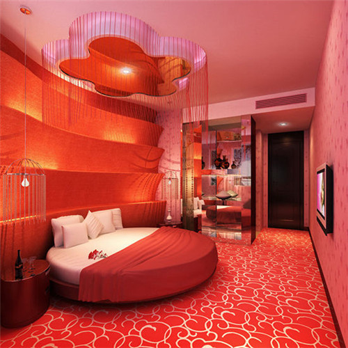 大红色的卧室空间显然是新婚夫妇的二人世界,从墙面到地板,再到红白相间的床品,无不洋溢着新婚的喜庆。圆床或许也有着圆圆满满的美好寓意。