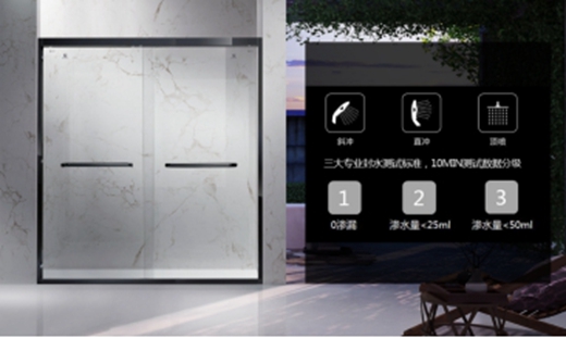 封水性是一个很庞统的概念,为了便于用户比较,中国淋浴房知名品牌玫瑰岛在欧洲EN14428所采用的斜冲、直冲、顶喷三大专业封水测试基础上改进,将测试时间从不到5分钟提高到10分钟,然后按测试数据将淋浴房的封水等级分为: 1、2、3三个等级,其中1级为滴水不漏。如今玫瑰岛主流的淋浴房产品都达到了1级封水标准,只有极少数款式的封水标准为2级(即使是2级标准也远超欧洲允许少量水珠的标准和行业渗透量不大于50ml的封水标准)。