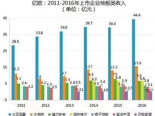 七家公司分别为大亚圣象、大自然、德尔未来、菲林格尔、扬子地板、宜华生活与欧宝家居,这里仅以其木地板业务收入做比较(菲林格尔、欧宝家居部分数据未公开)。图中可以明显地看出大亚圣象一直遥遥领先,其地板类收入与其他六家收入的总和持平。就目前的竞争格局而言,其他企业想要独自突破大亚圣象的业绩比较困难。