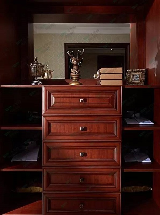 一间新古典风情的衣帽间映入眼帘,色彩稳重内敛,功能按照现代人的生活习惯和收纳的理念进行设计。