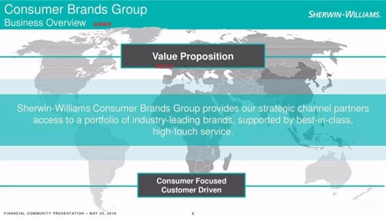 在业务概述一栏中,宣伟涂料是这样描述的:宣伟涂料“消费品牌集团”以为我们的战略合作伙伴提供一个行业内领先品牌的投资组合,由一流的、高水平的服务支持的价值主张,时刻关注着客户的动态。