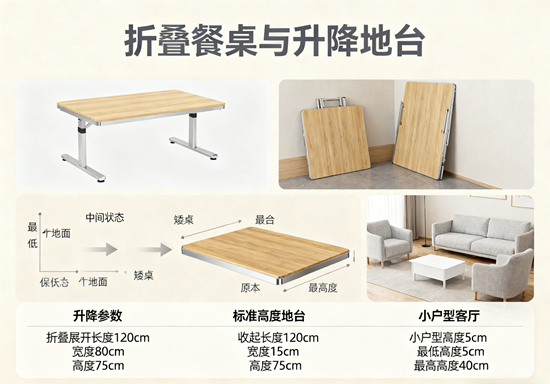 小户型的困扰,不是没有餐厅,而是餐厅太占地方。想象一下,当家人围坐在一张大餐桌旁,温馨的氛围里,突然发现这小小的客厅里,连转身都困难。但如今,这个困扰正在被一种"空间魔术"化解——折叠餐桌与升降地台,让小户型空间不再受限,而是充满了无限可能。