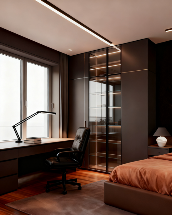 细节亮点:通过深灰色哑光柜体与透明玻璃的虚实切割,将收纳功能转化为空间视觉艺术——左侧封闭柜体满足日常衣物隐藏式收纳,右侧玻璃门区域以嵌入式线性灯光勾勒内部分层结构,形成“藏露平衡”的展示逻辑。材质上,金属收边条与木纹地板形成冷硬与温润的肌理对话,灯光设计采用“顶部漫反射+层板点光源”双重系统,既消除传统衣柜的压抑感,又通过光影层次强化空间纵深感。