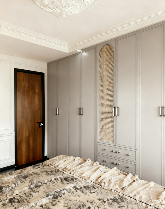 细节亮点:结合“隐奢美学×空间叙事”与浪漫法式元素,当前柜体在极简框架中注入优雅细节。柜体结构采用封闭+开放分区设计:左侧深灰哑光封闭柜以竖向线条分割,搭配金属拉手;中间藤编内置层弧形拱券造型嵌入,顶部石膏线浮雕与墙面装饰线条呼应,整体通过材质碰撞与光影层次实现储物功能与法式浪漫的融合。