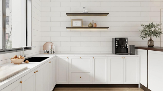 厨房用满墙也以星月白定制柜做基底,黄铜小拉手添了精致感,黑色厨电与纯白柜体形成柔和碰撞,清爽又温柔。